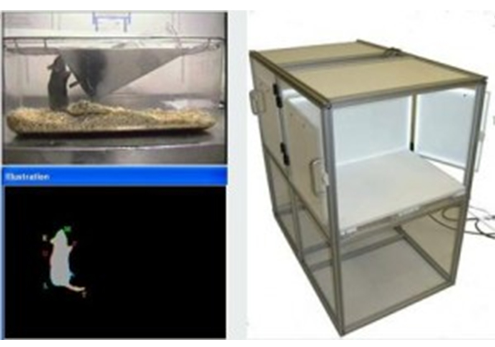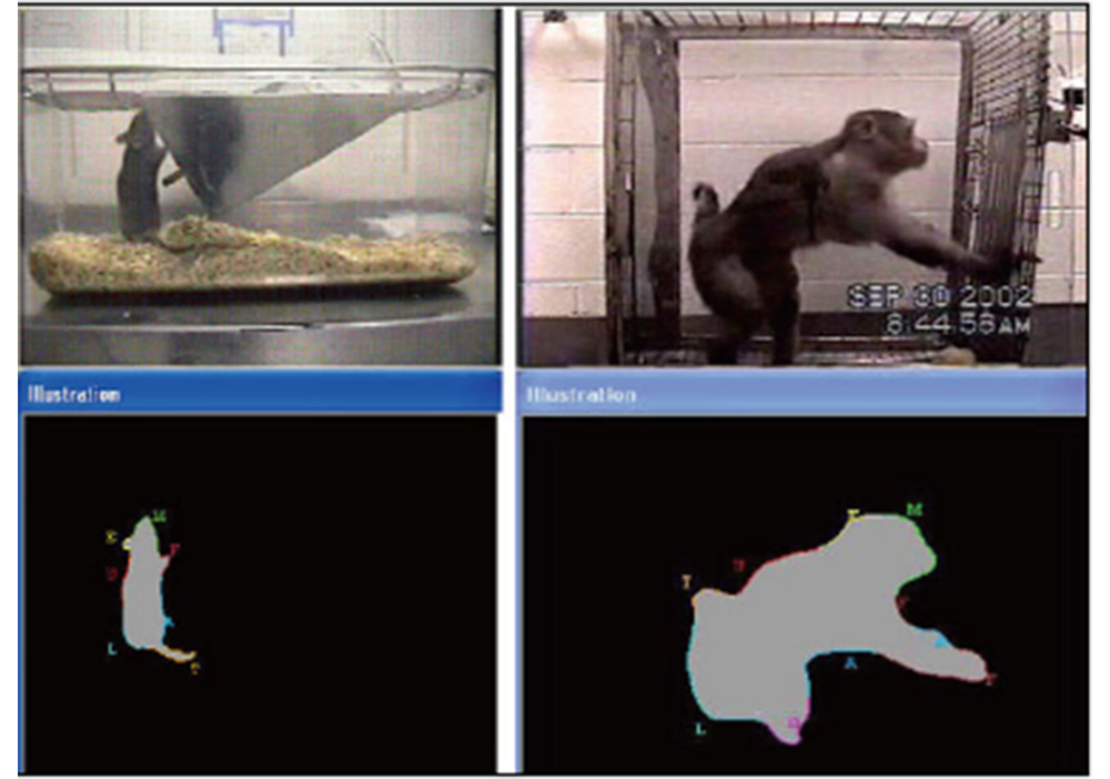 可分析動(dòng)物直立身體、回降身體、向左走、向右走、吃、喝、咀嚼、清理身體、排尿、垂直懸吊、偎著籠子懸吊、垂直降落、跳躍、轉(zhuǎn)動(dòng)、轉(zhuǎn)圈、睡覺、痙攣、覺醒、 挖掘找尋糧食、嗅、聞、間歇停頓 、伸懶腰等行為