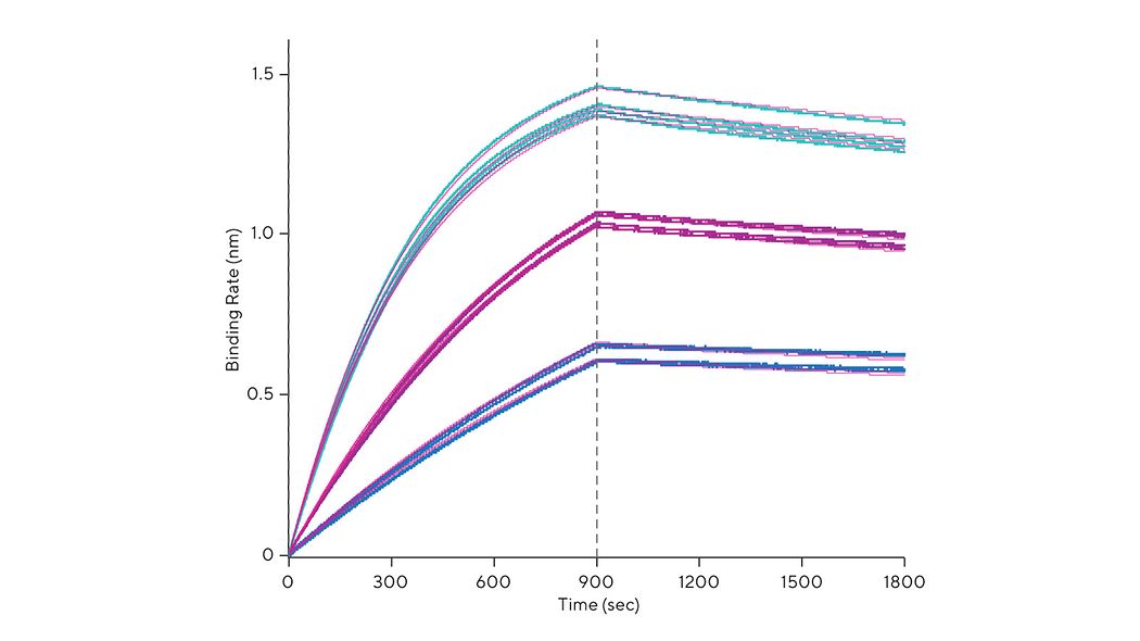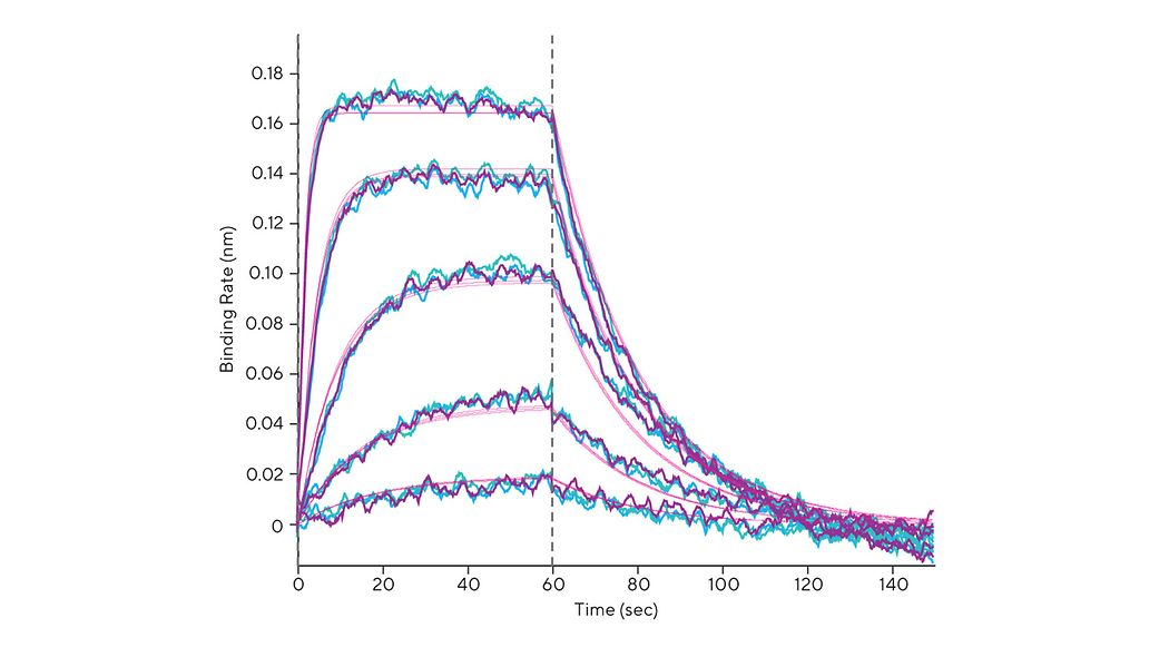 Octet® R4系統(tǒng)會實時監(jiān)測結合事件,將檢測表面直接定位在樣品上,計算結合速率(ka)、解離速率(ka)和親和力常數(ka),無需采用微流路技術。樣品板的溫度可控制在15–40°C之間,便于在不同的溫度下對溫度敏感型蛋白質進行可靠的動力學測定。樣品冷卻的其他優(yōu)勢還包括在多個溫度下快速測定結合速率常數,推斷出熱力學測量值。