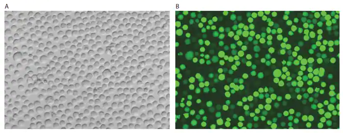 圖2. 使用Neon轉(zhuǎn)染系統(tǒng)對(duì)Jurkat細(xì)胞進(jìn)行高效轉(zhuǎn)染。在用Neon轉(zhuǎn)染系統(tǒng)轉(zhuǎn)染Jurkat細(xì)胞后24小時(shí),細(xì)胞成功表達(dá)了編碼EGFP的報(bào)告質(zhì)粒。B是A的相應(yīng)熒光圖像。