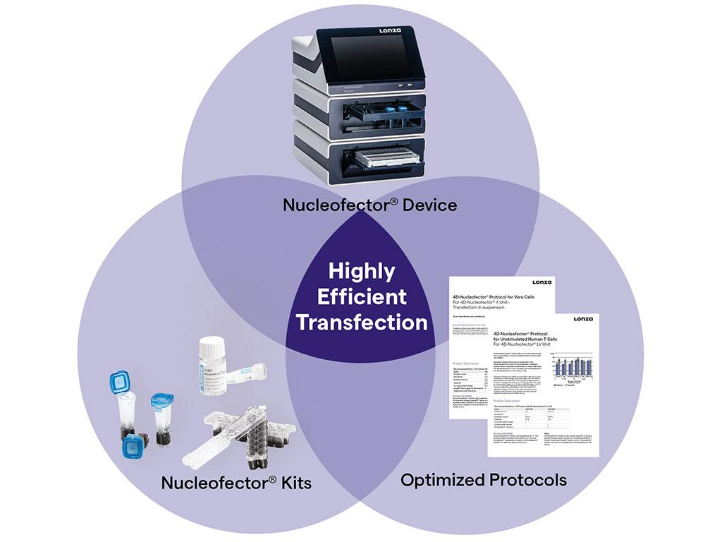 包含專用的 NucleofectorTM試劑。這些充當高轉染效率和細胞活力保護的環(huán)境,同時保持生理相關的細胞條件,還提供了指定的核轉染容器、移液管和熒光陽性對照載體(pmaxGFP對照載體)