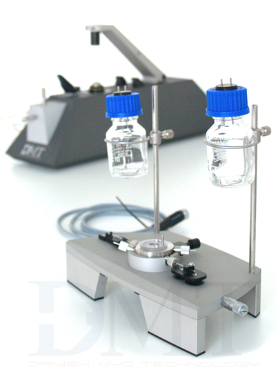 所有組件均可拆卸滅菌,利用這種封閉、滅菌的培養(yǎng)系統(tǒng),離體微血管最長培養(yǎng)期限可達(dá)七天。離體微血管培養(yǎng)系統(tǒng)整合了內(nèi)置DMT顯微鏡(含CCD相機(jī)),在培養(yǎng)過程中可連續(xù)監(jiān)測血管變化;在多通道系統(tǒng)中可同時監(jiān)測多個血管片段的變化。系統(tǒng)組件主要包括一個鐵架臺、內(nèi)置加熱裝置以及兩個灌注用壓力存儲瓶(實(shí)驗(yàn)過程中提供微血管內(nèi)腔流量)。壓力由外接壓力單元提供。