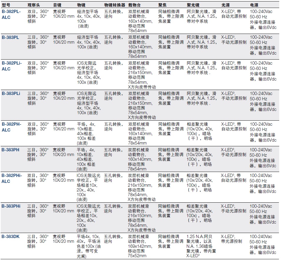 B-380系列的產(chǎn)品均根據(jù)不同的類型配備了兩種不同的光學(xué)系統(tǒng):標(biāo)準(zhǔn)的160mm類型以及無限遠(yuǎn)光學(xué)校正系統(tǒng)(IOS)。
